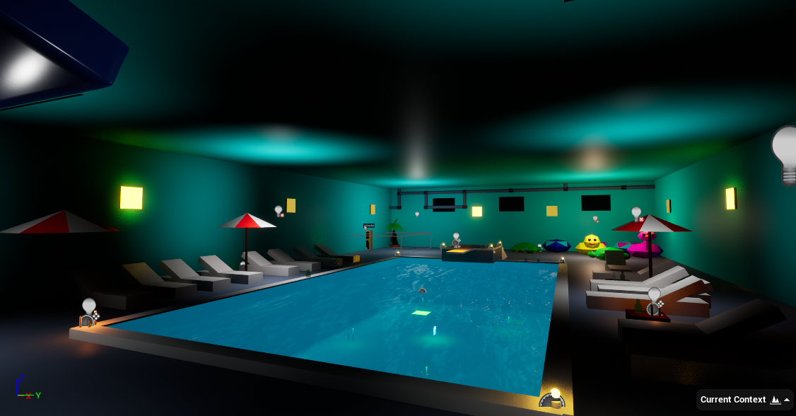 Environmental elements included pool platforms, diving boards, deckchairs, pool toys, warning signs, and atmospheric lighting.